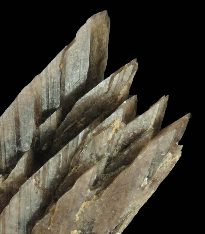 | Description: | Lustrous transparent-to-translucent brown axinite crystals with no matrix attached. The axinite crystals are rhombic form, in elongated aggregates to 70 mm of parallel crystals that are diverging from a common attachment point on the bottom |