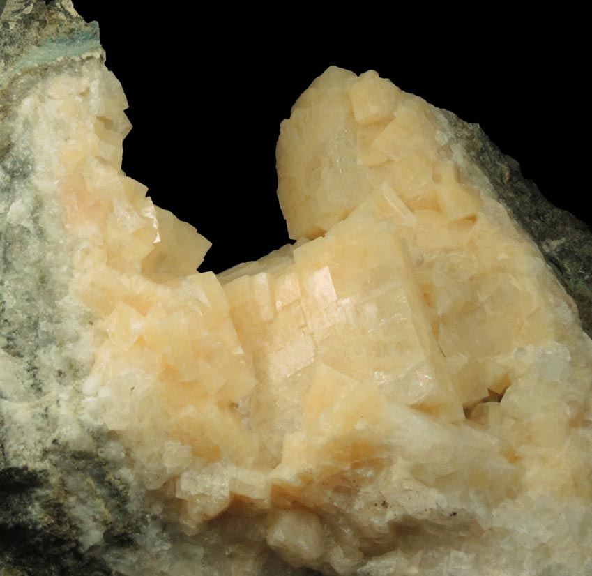 | Description: | Large pocket lined with lustrous transparent-to-translucent pinkish-yellow (beige) rhombic chabazite crystals to 11 mm, in sub-parallel aggregates to 26 mm across, over transparent colorless calcite crystals to 2 mm. Collected in 1980s to 1990s by Prof. Martin Becker |