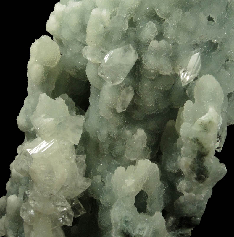 | Description: | Lustrous transparent colorless apophyllite crystals to 14 mm on stalactitic formations to 60 mm long of transparent colorless quartz microcrystals over green-gray matrix. The apophyllite crystals have pyramidal terminations. Ex. D. Miller Collection #M3911 |