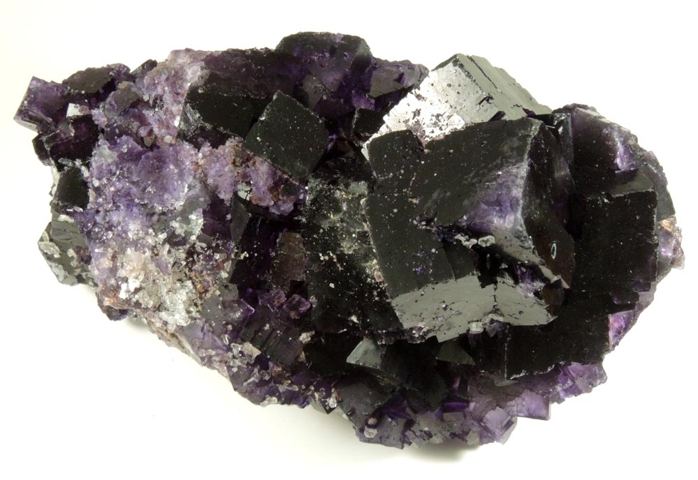 | Description: | Elongated double-sided cluster of lustrous dark-purple cubic fluorite crystals with no matrix attached. The surfaces of the fluorite crystals are composed of many smaller parallel cubic faces. Ex. Miller #M425 |