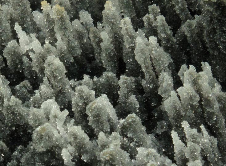 | Description: | Sparkling cluster of lustrous transparent quartz microcrystals over black cores in stalactitic formations to 15 mm in parallel orientation. A few stalactites are incomplete. Ex. Miller #M2937 |
