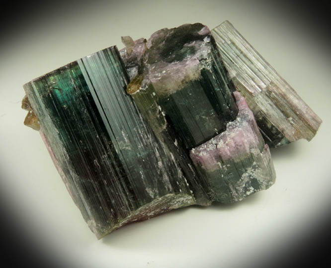 | Description: | Several interconnected transparent-to-translucent bi-colored elbaite tourmaline crystals with lustrous crystal faces and flat pinacoid terminations composed of many microscopic parallel pyramidal faces. Color varies from pink to green to blue-green. Ex. Miller #M473 |