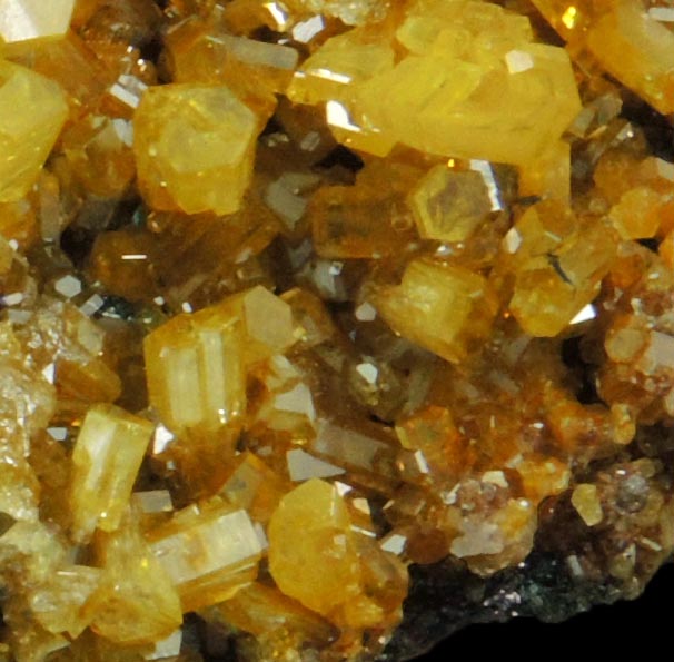 | Description: | Lustrous transparent yellow mimetite crystals to 6 mm overgrown on black metallic cesarolite (identified by Bill Pinch). The mimetite crystals are prismatic hexagonal form with basal pinacoid termination and {111} first-order pyramidal edge faces. Ex. Miller #2571; originally acquired from E. Greene in 2013 |