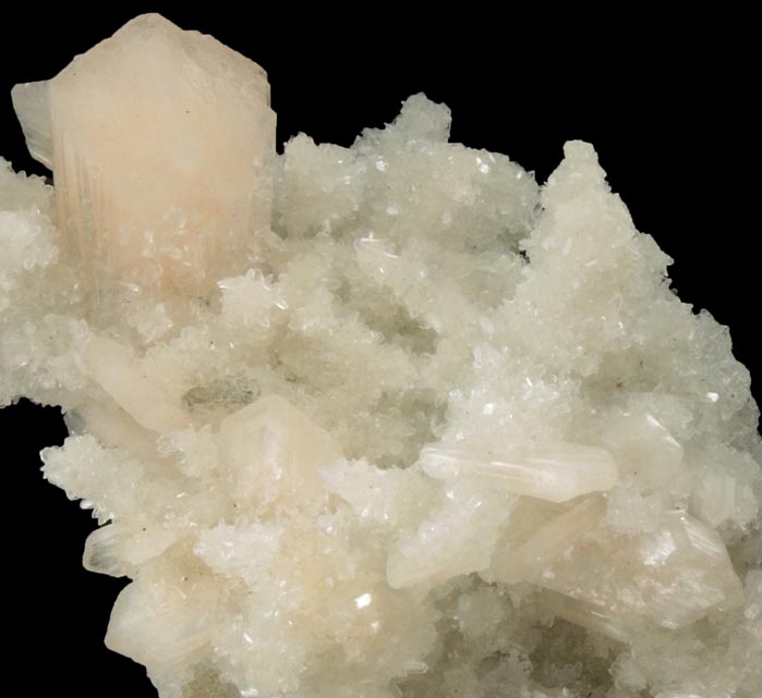 | Description: | Lustrous translucent doubly-terminated pale-pink bladed stilbite crystals to 30 mm on colorless quartz crystal epimorphs after anhydrite crystals to 10 mm long on rhombic transparent yellow calcite crystals to 20 mm. Ex. Miller M3319; ex. Betts #63169 in 2012 |