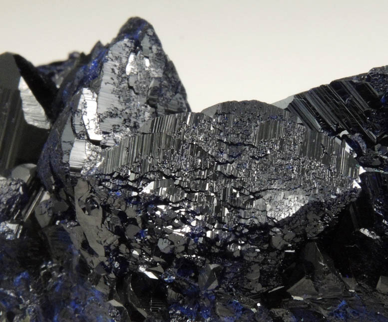 | Description: | Curved cluster of interconnected lustrous dark-blue azurite crystals to 24 mm with no matrix. The azurite crystals are wedge-shaped form with many parallel striations composed of parallel crystal faces. Two faces have contacts from adjacent crystals. Ex. Miller #M1455; collected in 2009 |