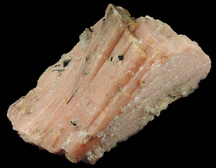 | Description: | Fan-shaped formation of elongated translucent pink-orange serandite crystals to 50 mm with overgrowth of lustrous transparent colorless analcime crystals to 1.5 mm with a few acicular black aegirine inclusions on the surfaces. |
