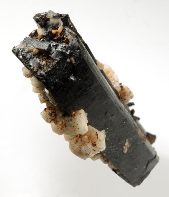 | Description: | Elongated 65 mm lustrous black aegirine crystal with partial overgrowth of lustrous translucent beige-colored microcline crystals to 5 mm. Ex. Miller #M1849 |