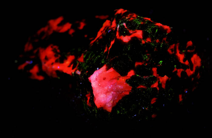 | Description: | Ore specimen of red zincite, black-metallic franklinite, brown willemite, and white calcite. Under shortwave UV illumination the calcite fluoresces orange and the willemite fluoresces green; under longwave UV only the calcite fluoresces. Ex. Miller #M3467 |