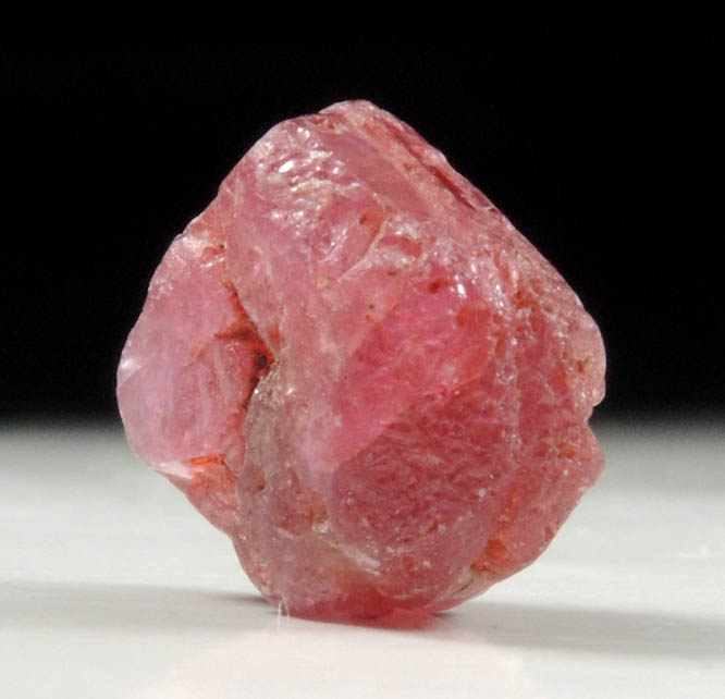 | Description: | Lustrous slightly waterworn translucent red-pink ruby crystal, the pink gem variety of the mineral corundum, with no matrix. The ruby crystal is complete on all faces and has complex linear patterns on the edges from the surrounding matrix. Fluoresces red under LW UV illumination. Weight: 8.23 carats |