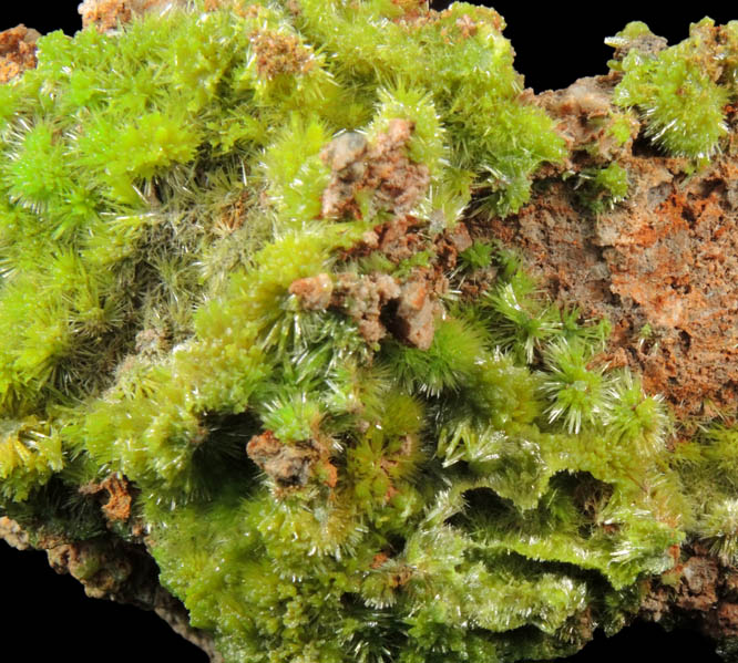 | Description: | Lustrous transparent-to-translucent green pyromorphite crystals over limonite-stained matrix. The pyromorphite crystals are slander tapered prisms in stellate groups to 5 mm. Originally acquired November 2009 |