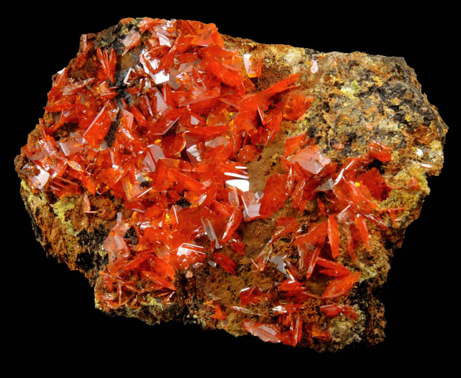 | Description: | Lustrous transparent vivid-red wulfenite crystals on brown matrix. The wulfenite crystals are square bladed form, with beveled edge faces. The red color of these wulfenite crystals is quite remarkable, especially under full-spectrum illumination. Ex. Miller #M2847; ex. Chris Wright (1946-2014) private collection; collected ca. 2006. See article Red Wulfenite From The Kuruktag Mountains in Mineralogical Record, Jan.-Feb. 2007 |