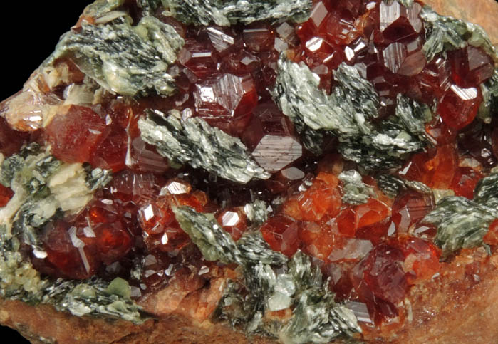 | AllMinerals/JohnBetts-FineMinerals > Online Mineral Museum Photographic Archive > Minerals from Italy > Grossular Garnet with Clinochlore |