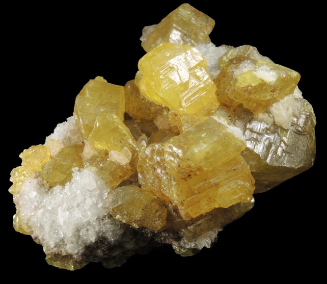 | Description: | Lustrous transparent-to-translucent yellow sulfur crystals to 24 mm with smaller translucent white scalenohedral calcite crystals to 4 mm on crystallized translucent gray celestine. The sulfur crystals have striated faces (caused by natural etching?) Ex. Ed Coleman collection |