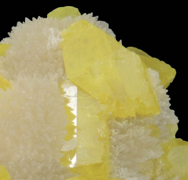 | Description: | Lustrous transparent vivid-yellow sulfur crystals to 18 mm on translucent white aragonite crystals to 1 mm. The sulfur crystals exhibit double-refraction similar to calcite. The aragonite fluoresces under SW-LW UV illumination, and phosphoresces. Ex. Miller #M3121 |