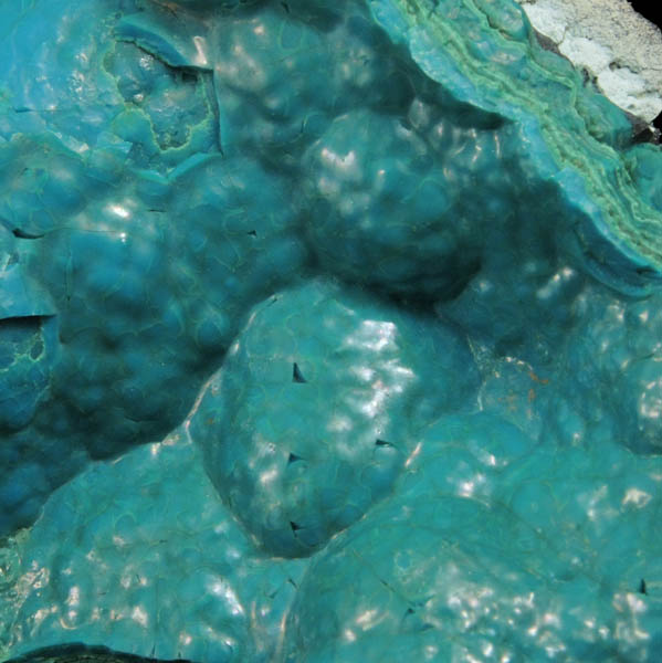 | Description: | Lustrous blue chrysocolla layered formations lining a shallow cavity in gray matrix. The chrysocolla looks like it melted, with rounded surfaces that follow the contours of the underlying rock. Ex. Miller #M3501; ex. Betts #70490 |