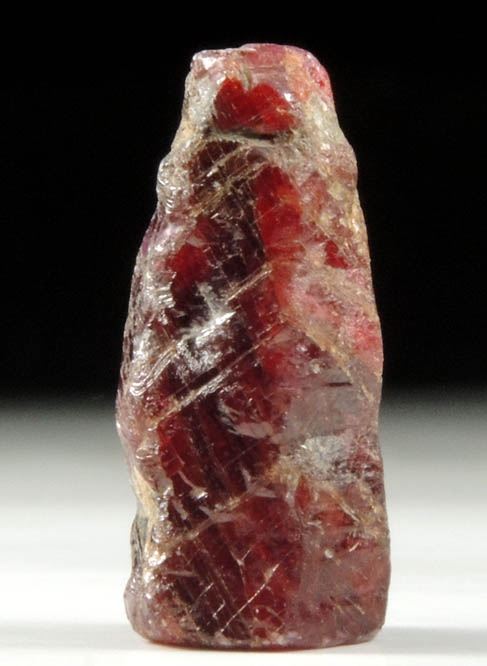 | Description: | Elongated tapered hexagonal translucent pink-red ruby crystal, the pink gem variety of the mineral species corundum, with horizontal striations on the prism faces and diagonal crystallization patterns that are typical in corundum crystals. Fluoresces red under LW UV illumination. Weight: 7.18 carats |