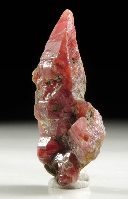 | Description: | Elongated di-pyramidal hexagonal translucent pink-red ruby crystal, the pink gem variety of the mineral species corundum, with two partial ruby crystals attached along with remnants of mica. Perhaps the mica can be scraped off. Fluoresces red under LW UV illumination. Weight: 6.82 carats |