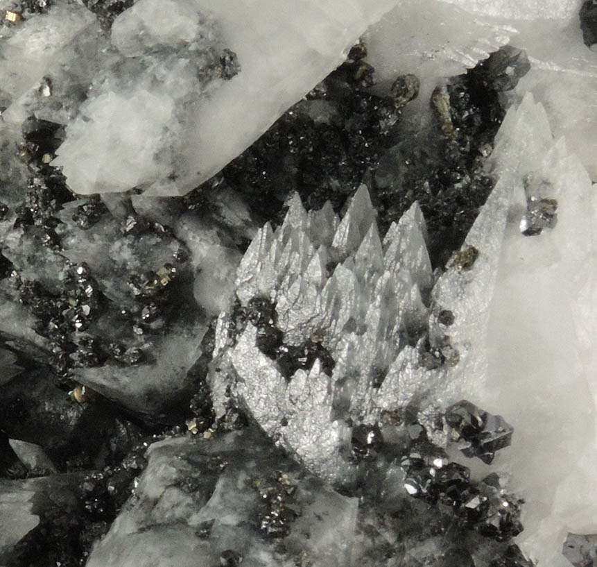 | Description: | Large cluster of lustrous translucent white scalenohedral calcite crystals to 60 mm with lustrous brown-black sphalerite crystals to 8 mm, and gray-metallic galena crystals to 2 mm, plus scattered yellow-metallic pyrite crystals to 1 mm. Ex. Miller #M2119 |
