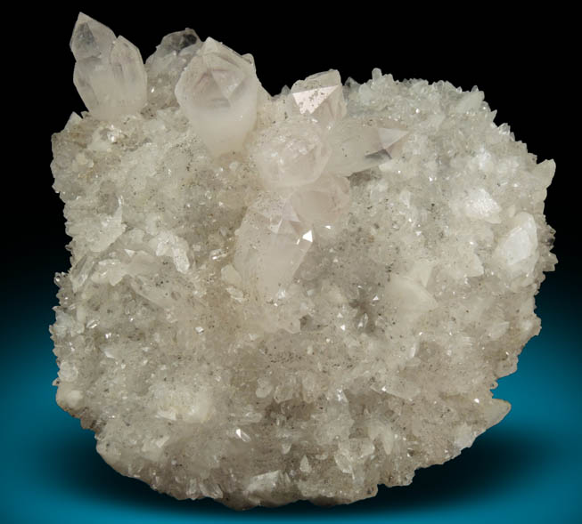 | Description: | Hemispherical cluster of lustrous transparent-to-translucent colorless quartz crystals to 16 mm, with pale-purple internal phantom-growth zones in the large crystals, over translucent colorless calcite crystals to 11 mm that fluoresce orange under LW UV. Ex. Miller #M2131; originally acquired in 2006 |