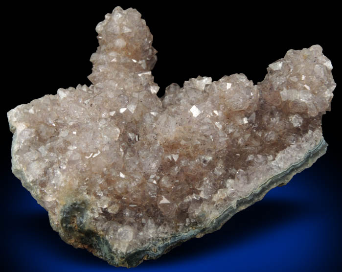 | Description: | Lustrous transparent gray-purple amethyst quartz crystals in stalactitic formations to 25 mm long on a plate of greenish basalt. Ex. Miller #M2899 |