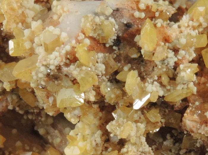 | Description: | Sparkling cluster, crystallized on all sides, of lustrous translucent yellow bladed wulfenite crystals to 5 mm, with translucent pale-yellow mimetite crystals in spherical aggregates to 1 mm, plus minor colorless calcite. |