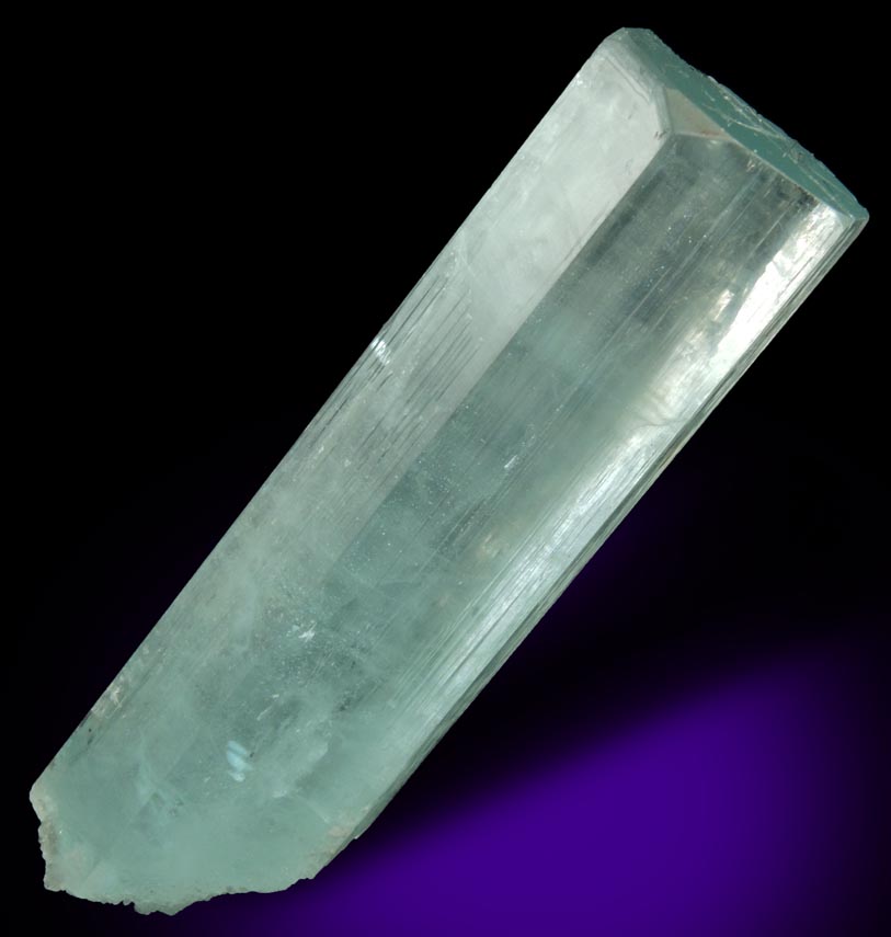 | Description: | Lustrous transparent aquamarine crystal, the blue gem variety of the mineral beryl, with no matrix attached. The aquamarine crystal has internal parallel linear bubbles that give it a chatoyancy, commonly labeled as Cat's-eye Aquamarine. |