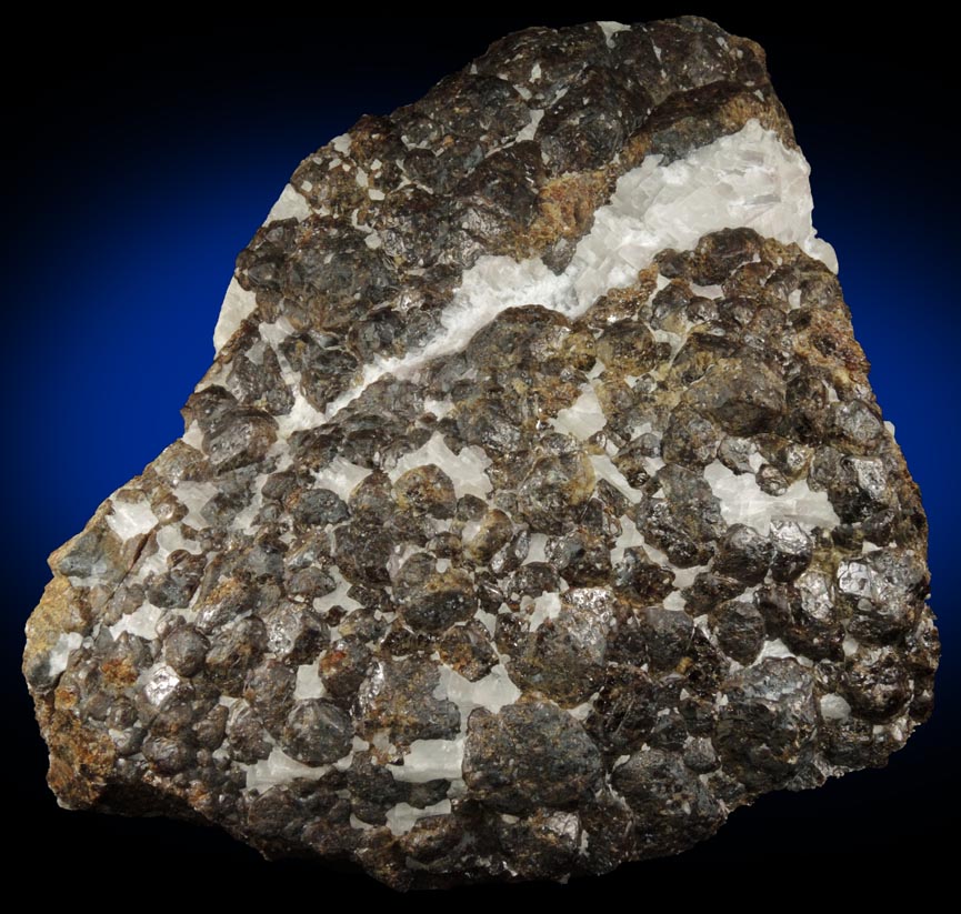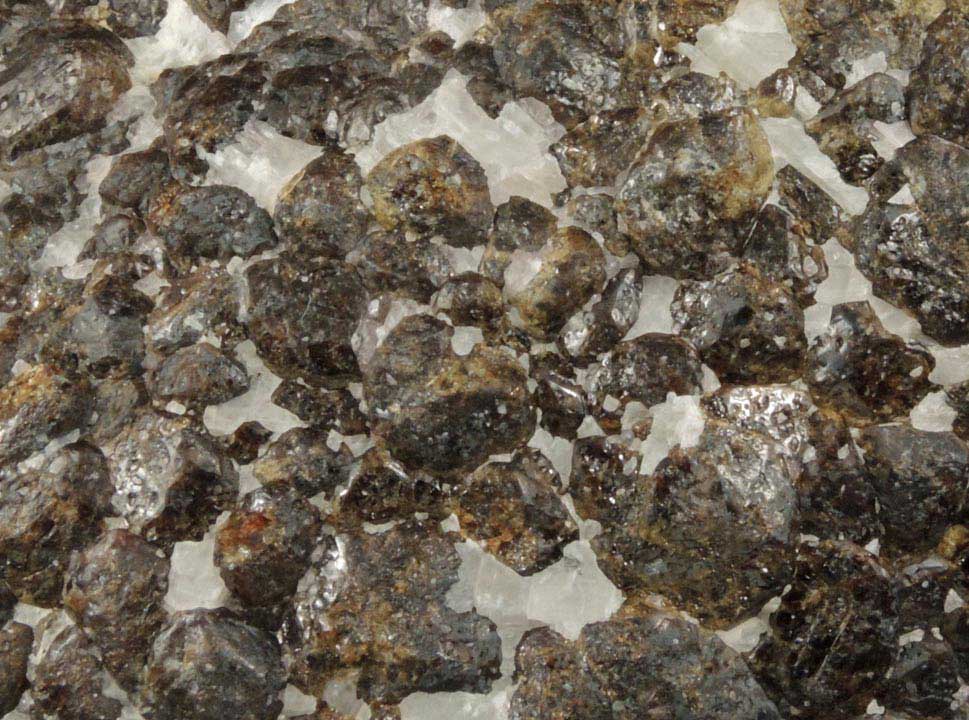 | Description: | Large crystallized mass of yellow-brown andradite garnet with translucent white calcite between the crystals. The calcite was chipped away to reveal a large face covered with well defined andradite garnet crystals. The calcite fluoresces under SW UV. |