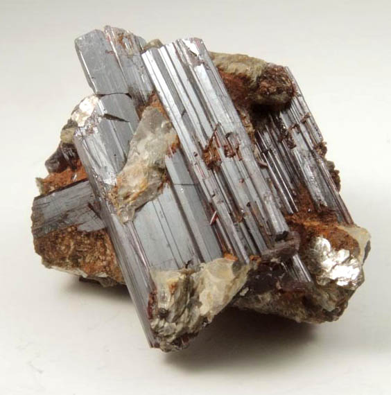 | Description: | Lustrous translucent red rutile crystals in groups of parallel crystals running through limonite-stained muscovite and quartz. Rutile specimens from the Onganja Mine were uncommon (Mindat.org only shows nine photos), and extremely difficult to obtain. From my personal collection; ex. Martin Farber collection |