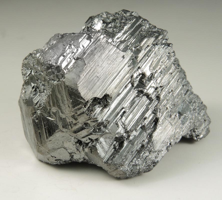 | Description: | Large lustrous gray-metallic complexly twinned bournonite crystals with parallel crystallization patterns on the faces and pyramidal terminations. One area of the bournonite crystals has remnants of matrix where they were attached. Bournonite, PbCuSbS3, is an uncommon lead-copper sulfosalt mineral. Weight: 47.9 grams. Reference: Mineralogical Record v.42#6, Rocks and Minerals v.80#1 |