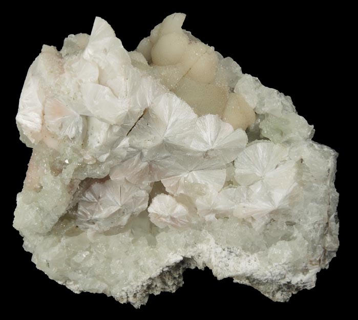 | Description: | Lustrous white fibrous pectolite crystals to 11 mm, in radiating aggregates with convex shapes, coated with lustrous transparent colorless apophyllite microcrystals, over lustrous translucent green datolite crystals to 6 mm with minor green prehnite. Ex. Chet Lemanski (namesake of Lemanskiite) collection #2065CL.. |