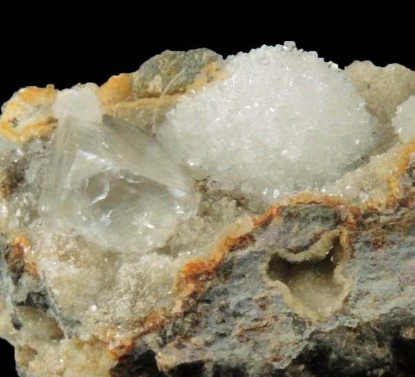 | Description: | Lustrous transparent thomsonite crystals in hemispherical aggregates to 7 mm diameter and a 6 mm transparent rhombic calcite crystal on lustrous transparent colorless chabazite crystals to 1 mm. Ex. Miller collection T2262; ex. Betts #60742; Ax Jeff Weissman collection #3921t4 |