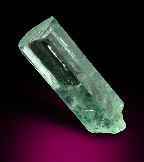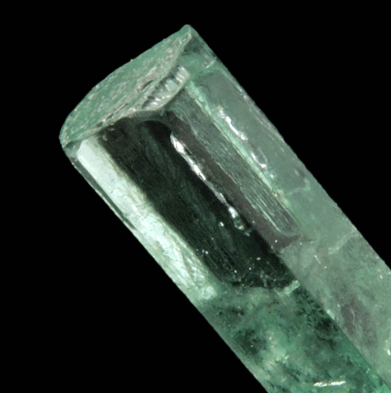 | Description: | Lustrous medium-green transparent emerald crystal, the green gem variety of the mineral beryl, with glassy crystal faces and flat, basal pinacoid termination that has complex parallel crystallization patterns. Weight: 2.68 carats (0.54 grams). Ex. Miller collection T2770; acquired from E. Greene in 2011 |