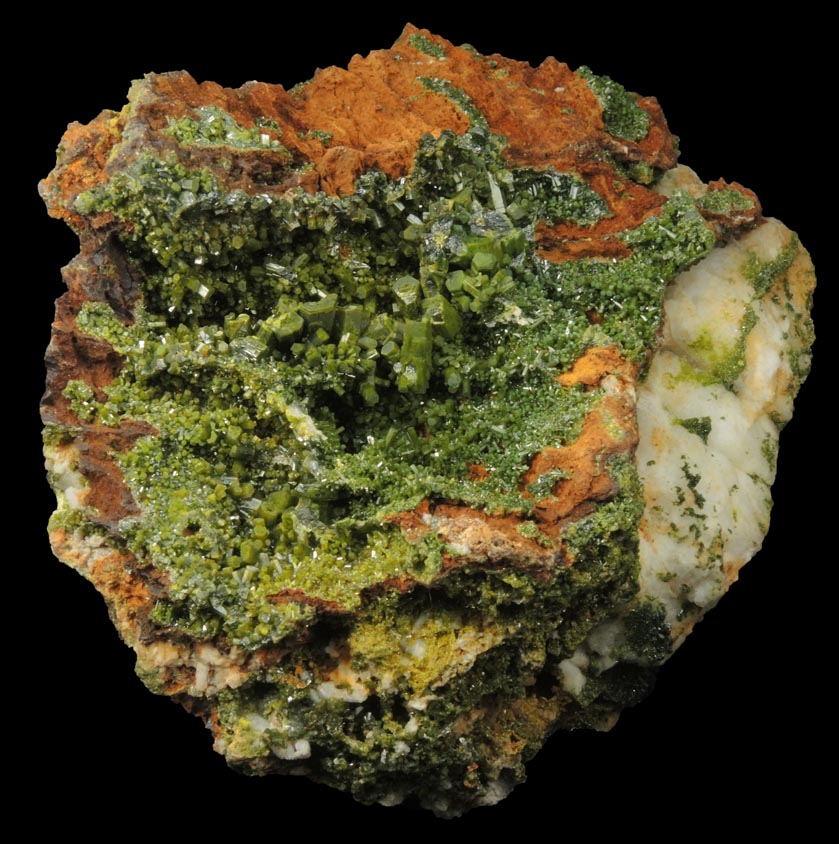 | Description: | Lustrous translucent olive-green pyromorphite crystals on brown limonite-rich matrix. The pyromorphite crystals are hexagonal form with basal pinacoid terminations. A rich pyromorphite specimen from the famous mine that closed in 1920. Ex. John H. Marshall (1931-2008) collection #2439; ex. Hingham Geologic Collection No. 59D |