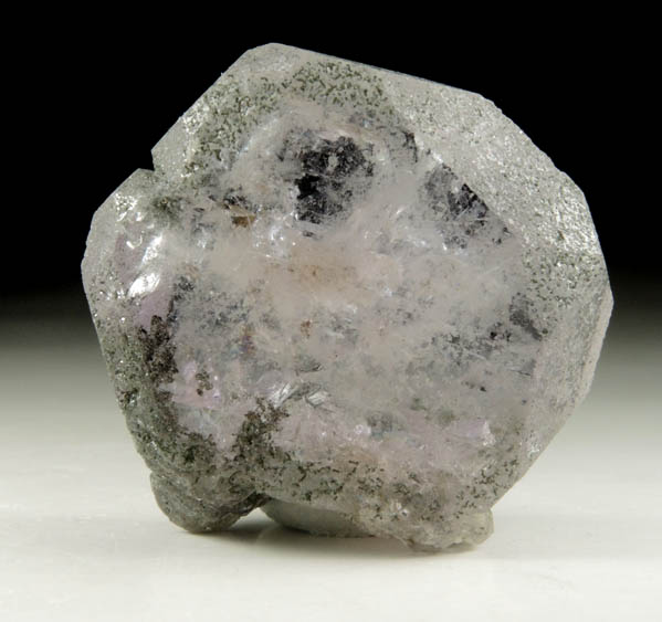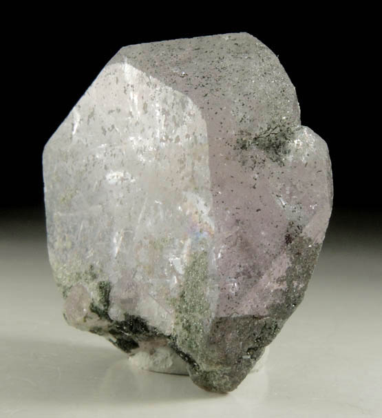 | Description: | Lustrous transparent pale-purple fluorapatite crystal with green chlorite included on the outer edges and in the bottom edge where the fluorapatite crystal was attached. The fluorapatite crystal tabular hexagonal form with secondary {111} corner faces. Ex. Miller collection T3710; ex. Betts #77329; originally acquired from D. Blauwet. Collected ca. 2017 |