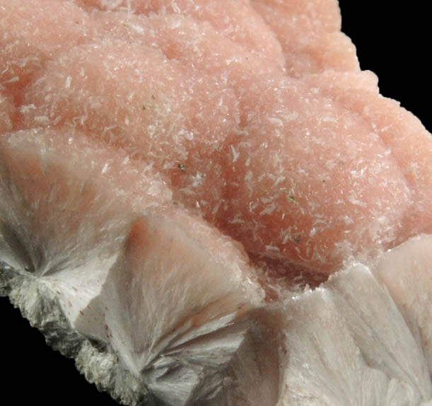 | Description: | Radiating fibrous white pectolite crystals in hemispherical aggregates to 8 mm diameter. The termination surfaces of the pectolite have pronounced pink color. These pink pectolite specimens from Millington rank among the best of the species. Ex. Miller collection T2562; ex. Betts #63596; collected by K. Hennig collected ca. 1996 |