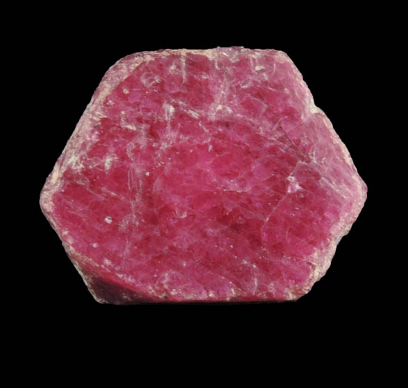 | Description: | Lustrous translucent red ruby crystal, the red gem variety of the mineral corundum, with no matrix. The ruby crystal is tabular hexagonal form, has vivid pink-red color, with remnants of light-colored clay on the edges. Fluoresces red under LW UV illumination. Weight: 6.2 grams |