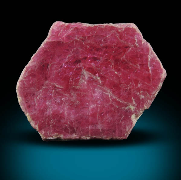 | Description: | Lustrous translucent red ruby crystal, the red gem variety of the mineral corundum, with no matrix. The ruby crystal is tabular hexagonal form, has vivid pink-red color, with remnants of light-colored clay on the edges. Fluoresces red under LW UV illumination. Weight: 7.3 grams |