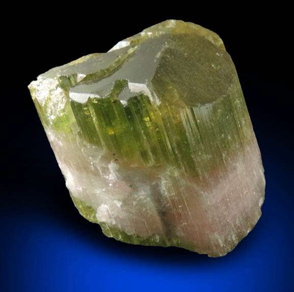| Description: | Lustrous bi-colored doubly-terminated elbaite tourmaline crystal fully crystallized all around. The elbaite crystal has a pink zone sandwiched between green terminations zones. Ex. Miller collection T3568 |
