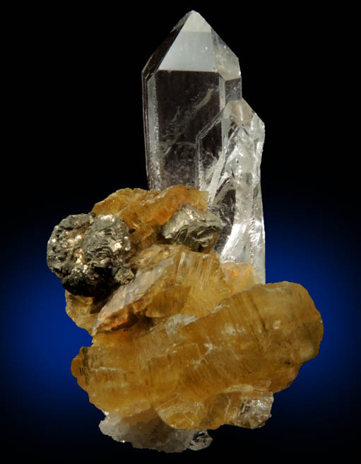 | Description: | Lustrous transparent colorless quartz crystals to 20 mm with lustrous transparent greenish-tan siderite crystals to 11 mm and yellow-metallic pyrite crystals in rounded aggregates to 7 mm across. Pyrite specimens from this mine are uncommon. Ex. Miller collection T3766; ex. Betts #78112; collected ca. 1965 |