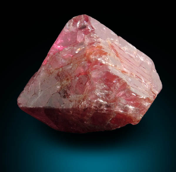 | Description: | Lustrous transparent-to-translucent pink-red spinel crystal with no matrix attached. The spinel crystal is octahedral form, with naturally rounded edges, and is incomplete on the bottom where it was formerly attached to matrix. Fluoresces red under LW-SW UV illumination. Weight: 3.9 grams. Ex. Miller collection T1242 |