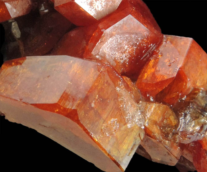 | Description: | Lustrous translucent orange-to-red vanadinite crystals that grew on intersecting thin spines of smaller vanadinite crystals. The vanadinite crystals are tabular hexagonal form and exhibit color zoning on some faces. Ex. Miller collection |