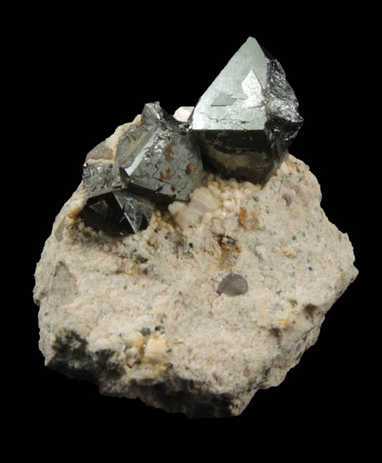 | Description: | Lustrous black-metallic octahedral magnetite crystals to 7 mm on tan-colored porphyry matrix. Ex. Miller collection T2518; originally acquired in 2012 from Chris Wright (1946-2014) |