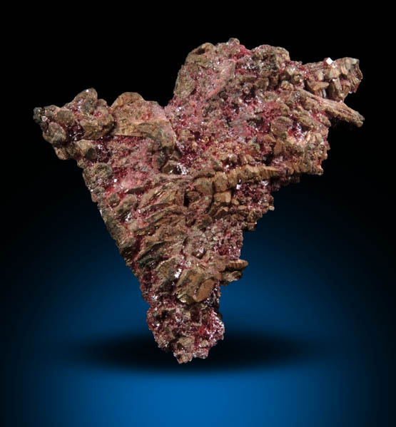 | Description: | Crystallized native copper showing herringbone patterns (parallel long crystals with smaller parallel crystals growing off the sides at right angles) with translucent dark-red cuprite microcrystals filling the spaces between the copper crystals. Ex. Miller collection T398; ex. Betts #42373 |