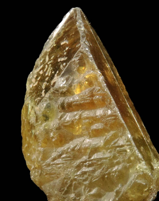 | Description: | Lustrous transparent yellow-green titanite crystals with no matrix attached. The titanite crystals are contact-twinned on the {100} plane with V-shaped reentrant crystal faces down the front edge indicating the twin plane. Ex. Miller collection T1806; originally acquired in 1991 from S. Ulatowski |