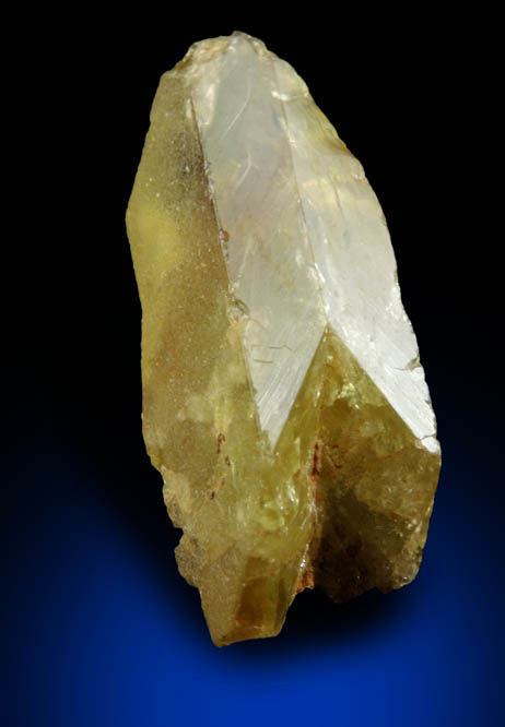 | Description: | Lustrous transparent yellow-green titanite crystals with no matrix attached. The titanite crystals are contact-twinned on the {100} plane with V-shaped reentrant crystal faces down the front edge indicating the twin plane. Ex. Miller collection T3334; originally acquired in 1991 from S. Ulatowski |