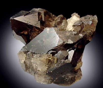 | Description: | Complex cluster of intergrown smoky quartz crystals to 1.5 cm long. Mounted in plastic box to prevent damage. Ex. R. Bates Collection #1298 |