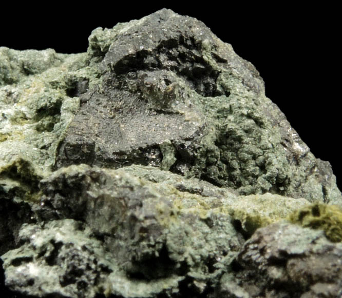 | Description: | Rare specimen of dark-metallic sphalerite crystals to 7 mm on greenish basalt with yellow metallic pyrite crystals to 2 mm. Pyrite and sphalerite are sulfide minerals and rarely found at this trap rock quarry. Ex. Miller collection T3668; collected ca. 1992 |