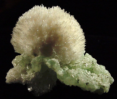 | Description: | Beautiful spray of white natrolite crystals to 15 mm long perched on light green prehnite matrix. From my personal collection. |