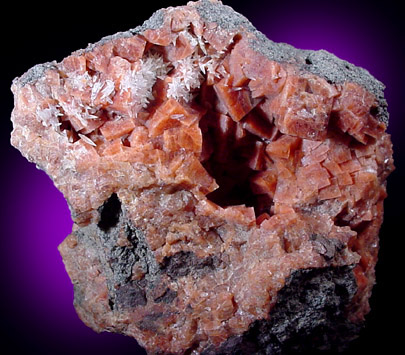 | Description: | Pocket of bright red rhombic crystals of chabazite to 15 mm. Thin scalenohedral crystals of colorless calcite to 5 mm long are scattered over the chabazite. Calcite fluoresces orange under UV illumination. Ex. Sidebottom collection #154 |