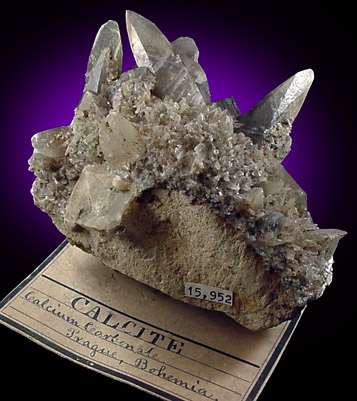 | Description: | Elongated translucent gray calcite crystals to 4 cm long on matrix from a classic old location. With old pen-and-ink label. Ex. Cilen collection #15952 |